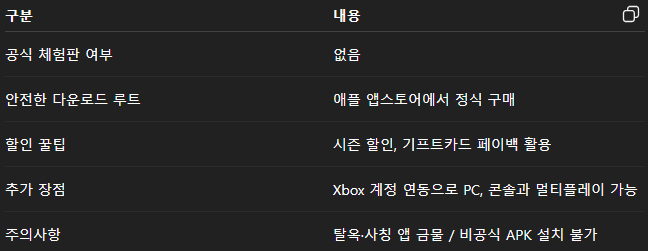 마인크래프트는 PC부터 모바일까지 유료 버전으로 제공되는데, 가격대가 만만치 않습니다. 아이폰 기준으로도 정식 버전은 약 9,000~10,000원 선입니다. 그래서 신규 유저들은 ‘이게 나한테 맞을까?’, ‘무료로 맛보기는 없을까?’ 궁금해할 수밖에 없죠.