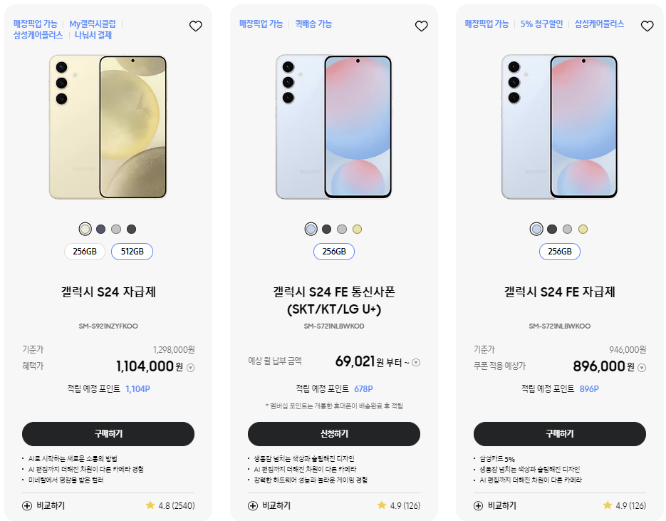 S24: 약 100만 원 초반으로 시작하며, 자급제 옵션이 더 저렴할 수 있습니다.